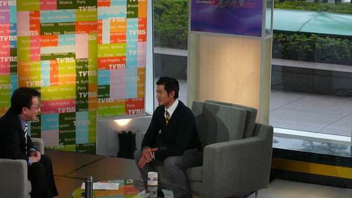 昨天早上上班時一進大廳右轉便看到工作人員在架設舞台與燈光,不知道是什麼節目要來樓下取景,中午下樓用餐時,才知道是TVBS的高峰會要在此出外景。用完餐回來時,竟然看到李四端在訪問郭富城